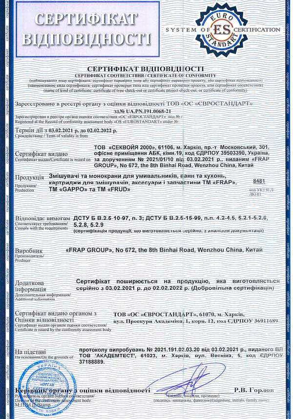 Всі вироби від Frap мають міжнародні сертифікати якості та визнані як у країнах Азії, так і СНД. Багаторічний досвід та грамотний підхід до справи дозволили компанії організувати постачання більш ніж до 50 країн світу. Ставлячи перед собою високі та складні цілі, компанія Frap прагне не тільки створювати якісний та надійний товар, а й організовувати дійсно комфортне та атмосферне середовище у місцях проживання своїх численних споживачів.